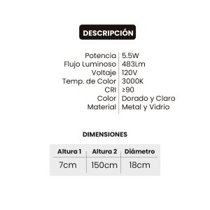 LAMPARA LED COLGANTE 5.5W 483LM 3000K 1898-GD